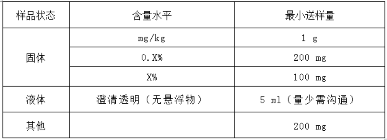 3.固体尽可能列出主要成份、杂质成份(有机物、无机物、是否硅基、碳基体材料等)及其含量,待测元素中最低含量;液体-写明介质成份(溶剂、酸碱种类及其(估计)含量);