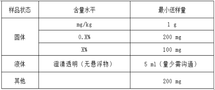 固体样品需干燥,金属样品为均匀粉末或碎屑、矿物在100目以下;液体样品需澄清透明,a纯氢氟酸、纯盐酸、硝酸、高氯酸、浓硫酸样品必须注明,强碱性样品需浓酸酸化后测试;b纯有机液体样品需特别注明;