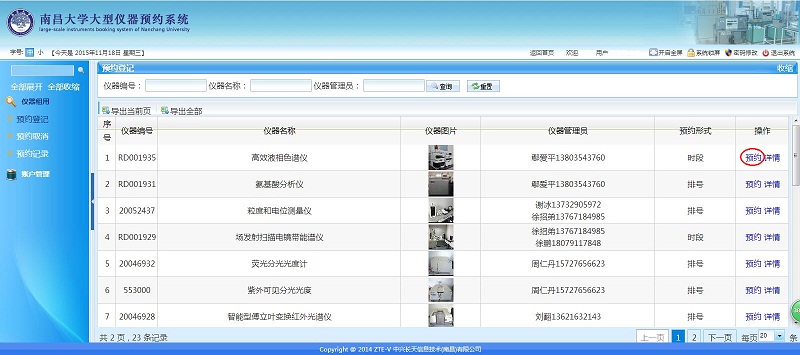 1. 登陆后,左边栏点击仪器租用→预约登记,会出现中心所有仪器设备,每台设备的指标参数和应用范围等信息可点击设备后面的详情进行查看。